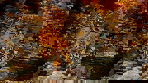 A former royal hunting reserve, the terrain of Bandhavgarh National Park is relatively diverse, with rocky peaks, sweeping forest and grassy meadows, making it a haven for a wide variety of animals. In addition to tigers, you can glimpse leopards, sloth bears, hyenas, sambar, Bengal foxes and barking deer. The south of the park also boasts the remnants of ancient Bandhavgarh Fort. While its exact origins are something of a mystery, it is believed to have roots dating back to the third century.